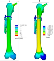 The femur model was initially analysed with standing posture loading and boundary conditions (Figure 4). The femur model was subjected to the different bodyweight loading conditions:(1) 490 N, (2) 540 N, (3) 588 N, (4) 640 N, and (5) 860 N. The distal part of the femur bone was constrained with all degrees of freedom.